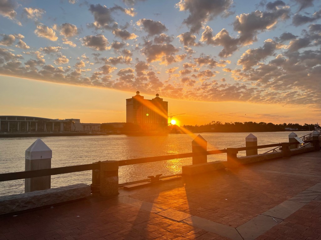 Last night I worked that security event on River Street I had mentioned yesterday. When I arrived to start my shift, Savannah was hopping. Thousands of visitors were reveling in the weekend festivities. The Jamaican DJ at Rousakis Riverfront Plaza was mixing some great Reggaeton. People were dancing, singing, moving to the music, shopping, laughing. It was a beautiful array of God’s people. The night slowly simmered down and I was able to witness the beauty of the stunning sunrise, pictured above, a gift from the Father to remind me how amazing this world is. A reminder of how easy this life was meant to be for us. How if we just loved God and took care of creation, we could be thriving on a healthy planet. And if we loved all people, as Jesus loved us, we would celebrate the beautiful diversity of all God’s children, each and everyday.