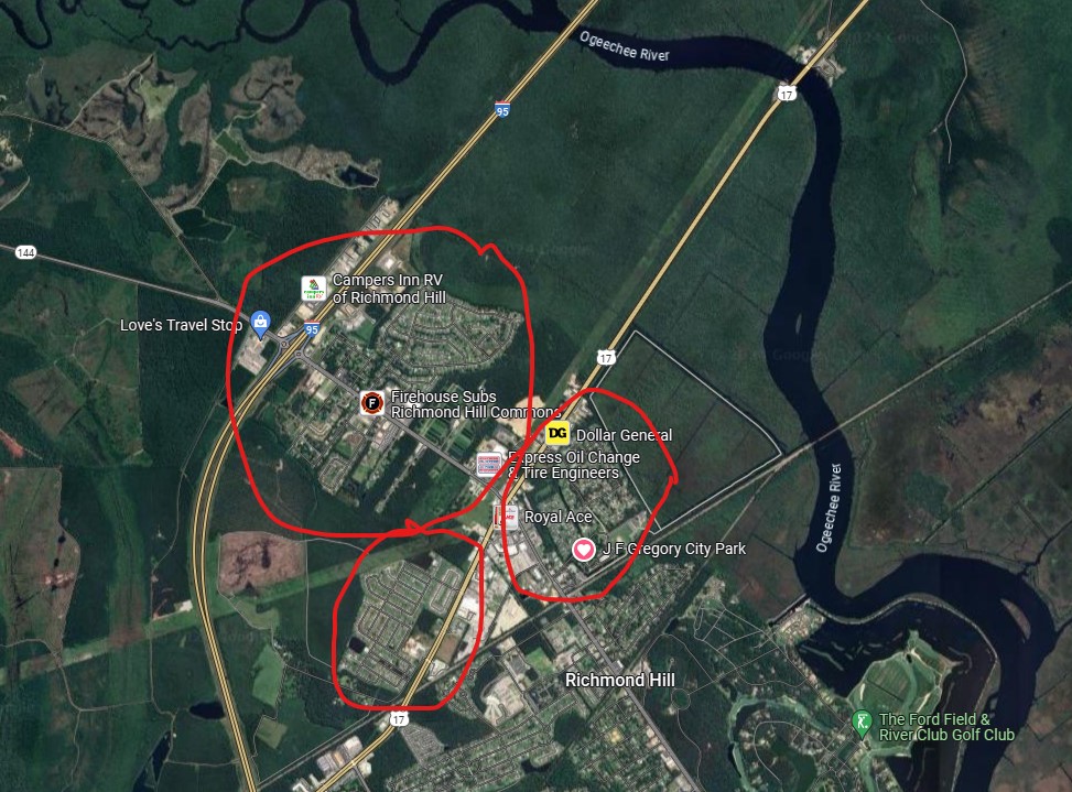 The response from local churches, including our own home church, Compassion Christian, (who conducted a donation drive of non-perishable foods), has been inspiring. The flooding from the slow-moving Debby shocked this small community and showed how grossly unprepared the utilities services are for major natural disasters. The flooding in Richmond Hill, from what we have learned in the community was a result of the Ogeechee’s watershed being flooded and the water entering the sewer system, resulting in the water rising from the sewers and flooding several neighborhoods. We were perplexed at how this could happen, as you can see from the picture below, most of these neighborhoods were far from the Ogeechee River, and very few communities along the Ogeechee actually flooded.